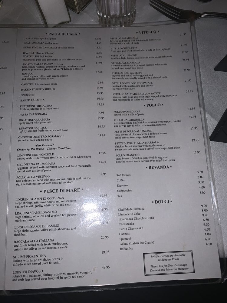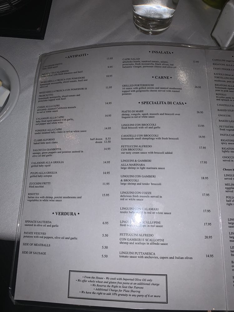 Introducing the menu at Capri Ristorante Italiano, a hidden gem in Palos Heights, IL. Their signature Capri Salad with artichoke hearts, sundried tomatoes, and prosciutto is a must-try. Indulge in their flavorful Calamari Fritti and Mozzarella Fresca con Pomodori appetizers. Vegetarians can enjoy dishes like Spinach Sauteed and Patate Vesuvio. Customers rave about the generous portions, high-quality ingredients, and reasonable prices. The attentive staff and welcoming atmosphere make it a top choice for a delicious Italian meal. Don't miss out on their Rigatoni Campignola and don't forget to make a reservation for a memorable dining experience at Capri Ristorante Italiano.
